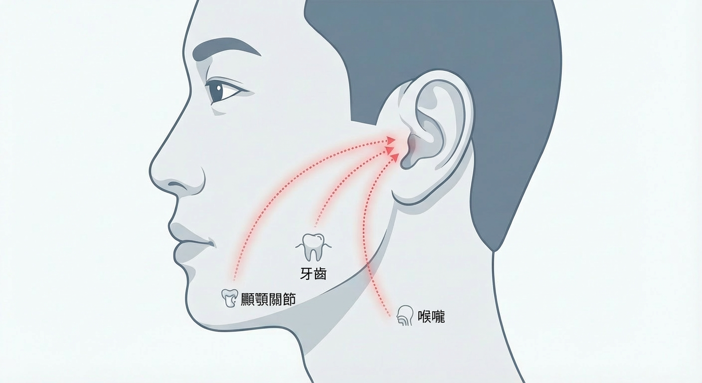 - 成因: 扁桃體炎、磨牙、蛀牙或智齒問題,疼痛神經放射至耳部。