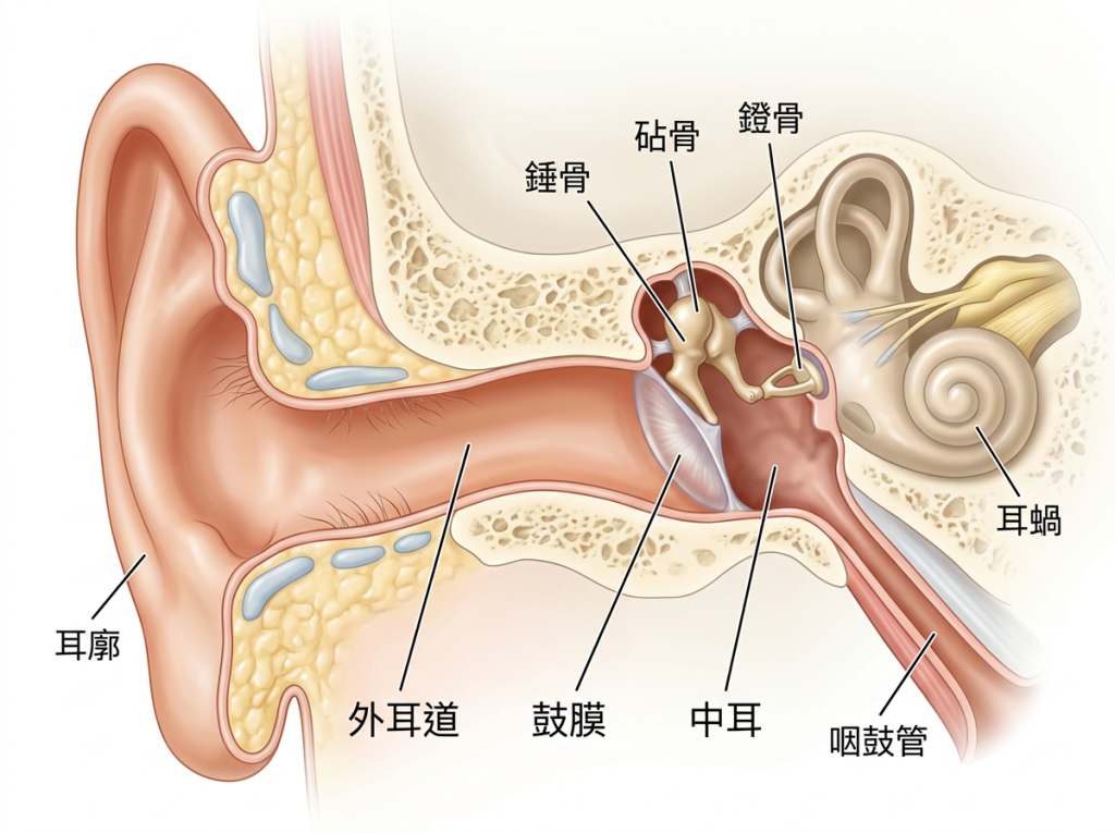 鼓膜是位於外耳道最深處、厚度只有約 0.1 毫米的結構,主要由三層薄膜組成,包括外層扁平上皮、中層纖維組織與內層黏膜層(3)。它將外耳與中耳分隔開,既能傳導聲波,也能防止中耳受到外界細菌、灰塵與水分侵入。